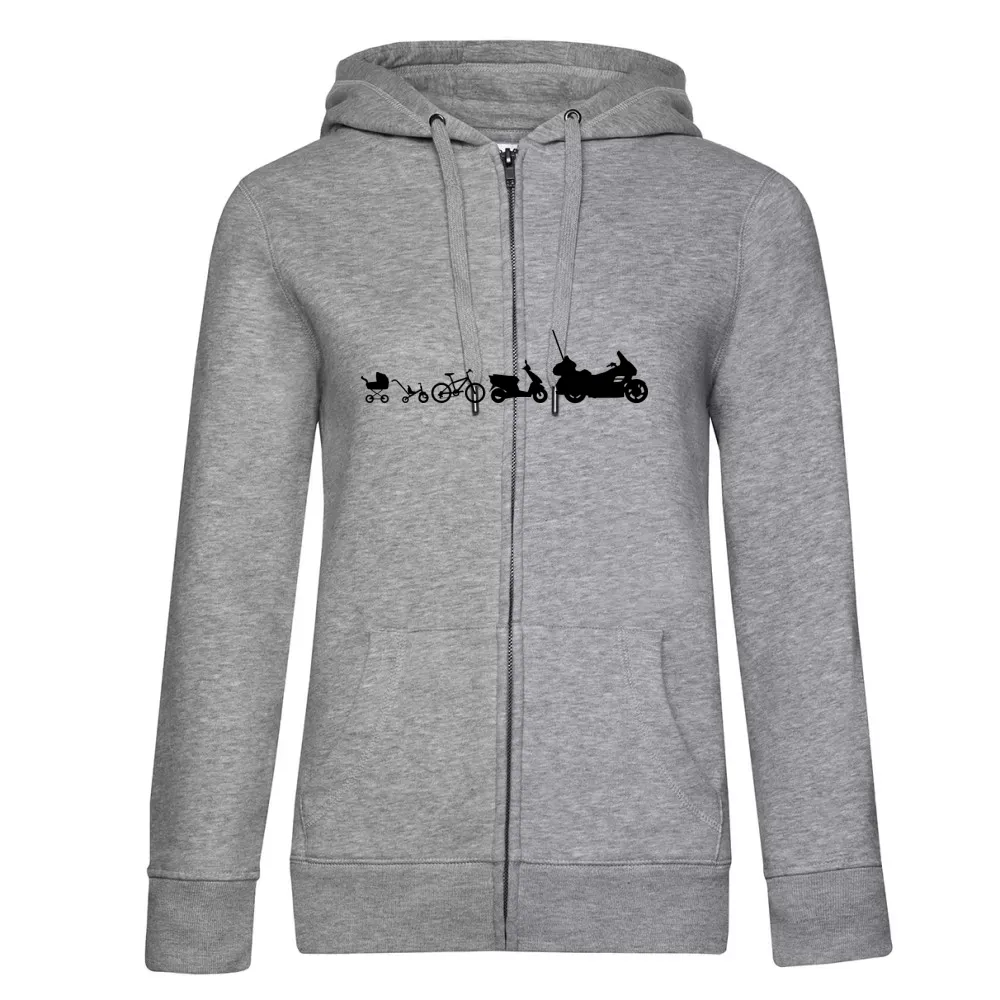 Das Design zeigt die Evolution des Motorrads und spricht die Verbundenheit zur Reise und zum Abenteuer an. Tragen Sie dieses einzigartige Motiv auf Ihrem Kapuzenjacke Frauen Hoodie und drücken Sie so Ihre Leidenschaft aus. Egal, ob Sie auf der Straße unterwegs sind, in der Garage arbeiten oder einfach nur im Alltag unterwegs – dieses Motiv wird garantiert zum Blickfang.