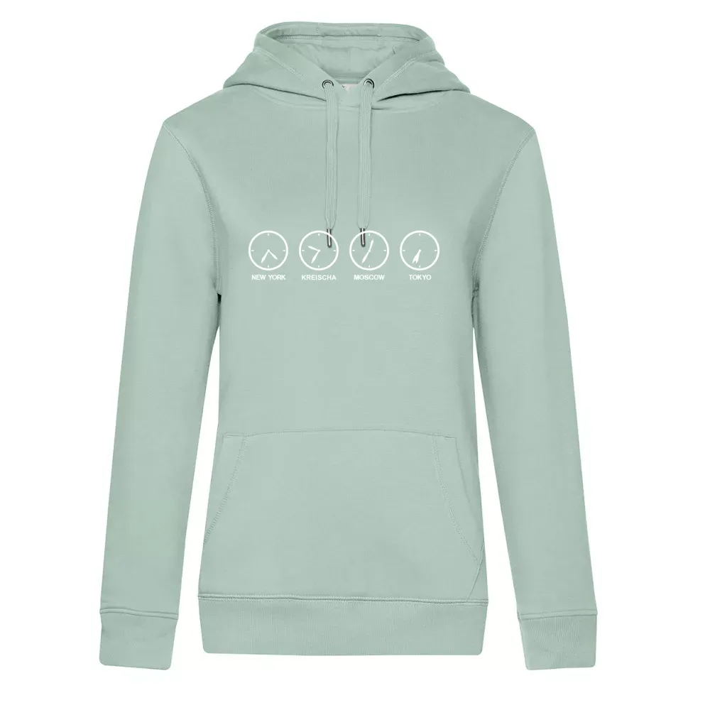 Hergestellt aus hochwertigem 80 % einlaufvorbehandelte, ringgesponnene, Baumwolle, gekämmt - 20 % Recyceltes Polyester, bietet Frauen Hoodie sowohl Komfort als auch Langlebigkeit. Die angenehme Stoffqualität sorgt dafür, dass du dich rundum wohlfühlst, egal ob du das Kleidungsstück im Alltag oder zu besonderen Anlässen trägst. Die Darstellung der Zeitzonen enfatiziert eine globale Perspektive und besticht durch ihre kreative Gestaltung.