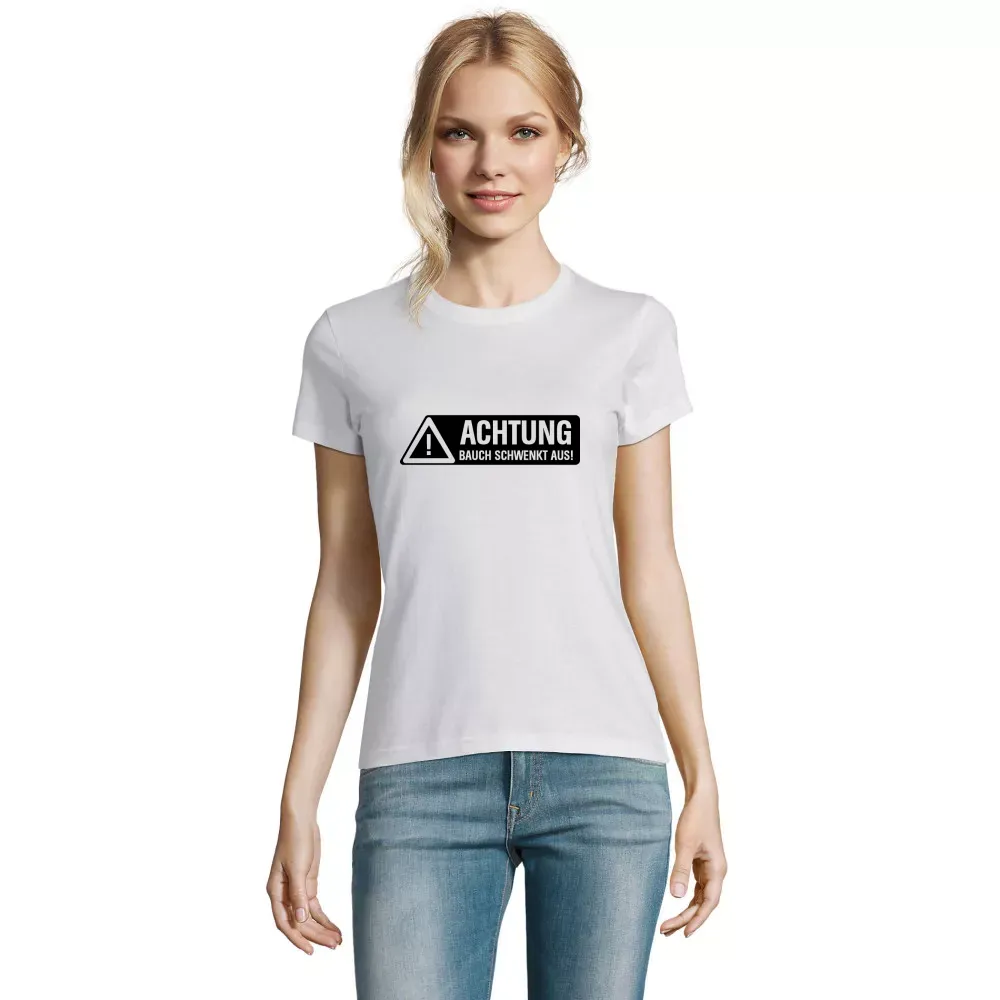 Bringen Sie mit dem Motiv Achtung Bauch schwenkt aus! ein Stück Lebensfreude und Humor in Ihre Garderobe. Egal ob als Geschenk für Freunde oder für den eigenen Kleiderschrank – dieses Frauen T-Shirt ist ein Muss für jeden, der das Besondere sucht. Setzen Sie auf witzige Designs, die gute Laune verbreiten und einen bleibenden Eindruck hinterlassen.