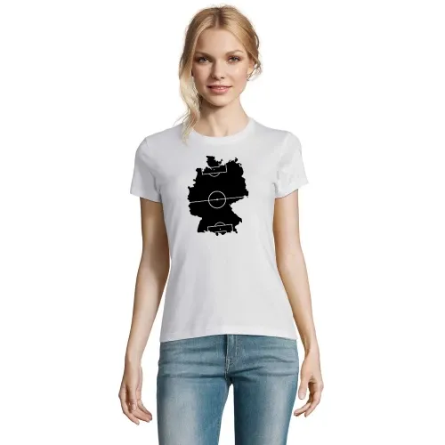 Perfekt für jeden Anlass – ob als Geschenk für den Fußball-Fan in Ihrem Leben oder als persönliches Fashion-Statement. Tragen Sie Ihr Leidenschaft zur Schau und setzen Sie ein Zeichen mit unserem Fußballfeld Deutschland Motiv auf Frauen T-Shirt.