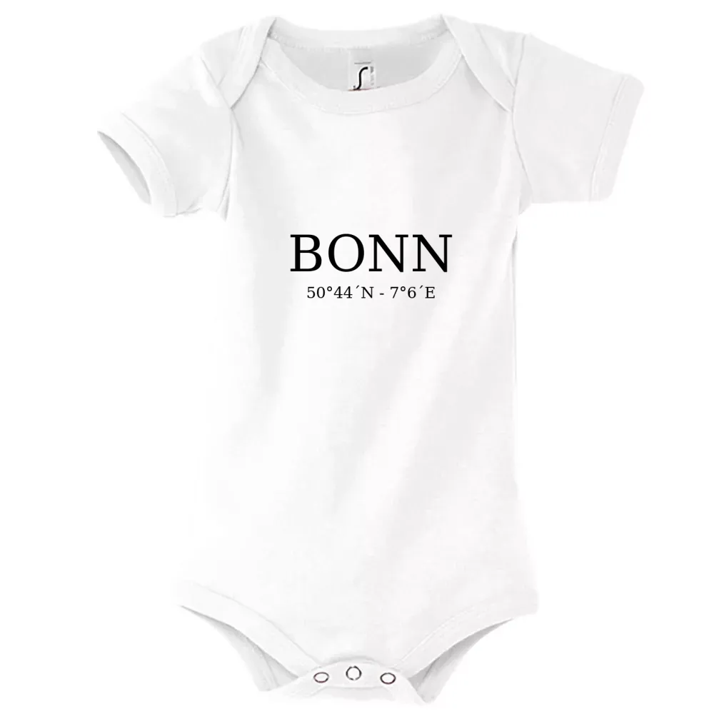 Das Design dieses Strampler Kinder Body zeigt die geographischen Koordinaten von Bonn und ist ideal für Stadtliebhaber und Reisende, die das Besondere schätzen. Es ist nicht nur ein modisches Statement, sondern auch eine Hommage an eine Stadt, die sowohl kulturell als auch historisch von großer Bedeutung ist. Die Urbanität und Kreativität Bonns spiegeln sich in jedem Detail dieses einzigartigen Motivs wider.