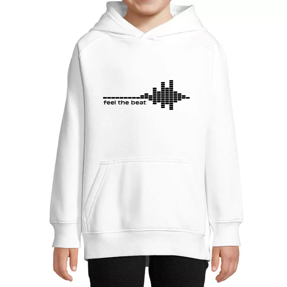 Warte nicht länger und bring deinen persönlichen Style zum Ausdruck – mit dem „Feel the Beat“-Motiv auf Kinder Hoodie aus 80 % Bio-baumwolle - 20 % recyceltes Polyester. Mach dich bereit, im Takt des Lebens zu schwingen und fühle den Beat!