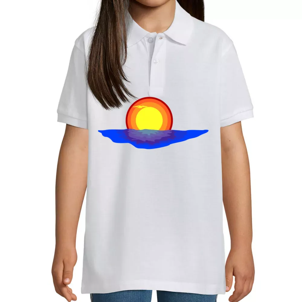 Genießen Sie die Schönheit eines Sonnenuntergangs im Meer mit unserem einzigartigen Kinder Polo. Dieses Design fängt den magischen Moment ein, wenn die Sonne langsam im Horizont verschwindet und dabei das Wasser in ein spektakuläres Farbenmeer verwandelt.