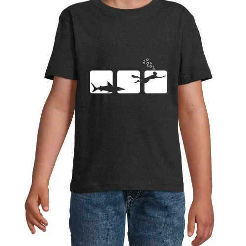 Das Zusammenspiel von kraftvollen Farben und dynamischen Linien lässt die Szene lebendig werden. Der Hai, majestätisch und stark, symbolisiert die unbändige Kraft der Natur, während der Taucher den Mut verkörpert, in die tiefen Gewässer einzutauchen. Jedes Mal, wenn du dein Kinder T-Shirt trägst, wirst du an die Abenteuer und Herausforderungen erinnert, die das Leben zu bieten hat.