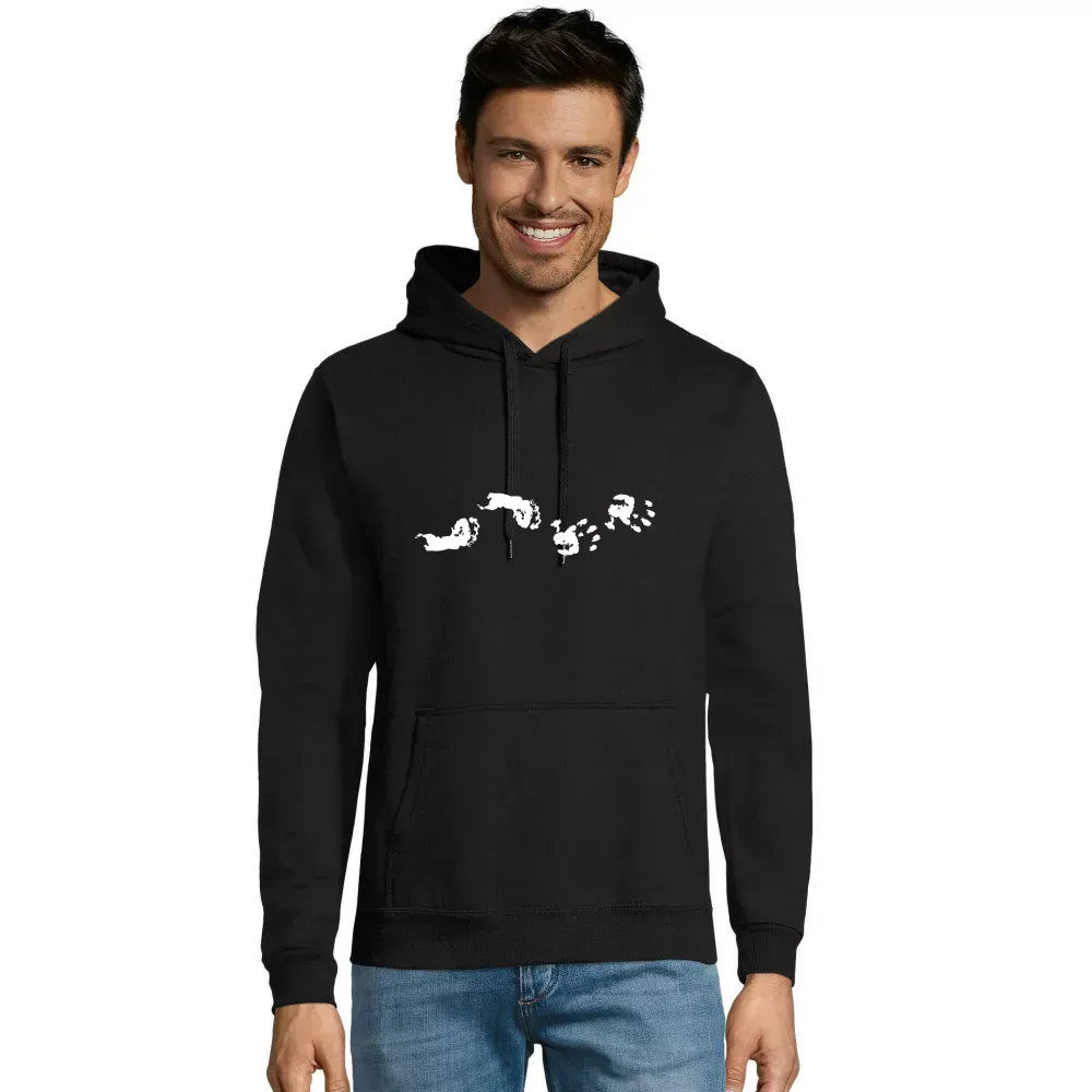 Einzigartige Erinnerungen festhalten mit unserem Baby Hand- und Fussabdruck Motiv auf Kapuzenpulli Männer Hoodie. Jedes Stück ist mehr als nur ein Kleidungsstück; es ist ein wertvolles Andenken an die kostbaren Momente der frühen Kindheit. Der zarte Abdruck der kleinen Hände und Füße Ihres Babys wirkt nicht nur niedlich, sondern erzählt auch eine ganz persönliche Geschichte.