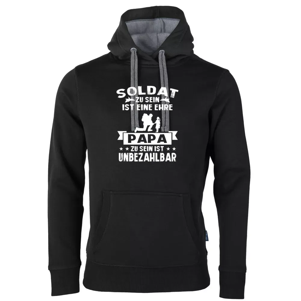 Bestelle hier dein Bundeswehr Vater Ehre - Soldat Papa mit Tochter Hoodie aus 80 % Baumwolle 20 % Polyester und gestallte es individuell nach deinen Vorstellungen. Kombiniere dein Bundeswehr Vater Ehre - Soldat Papa mit Tochter Hoodie mit dem dazu passenden T-Shirt sowie Capi für ein rundum stimmiges Outfit.