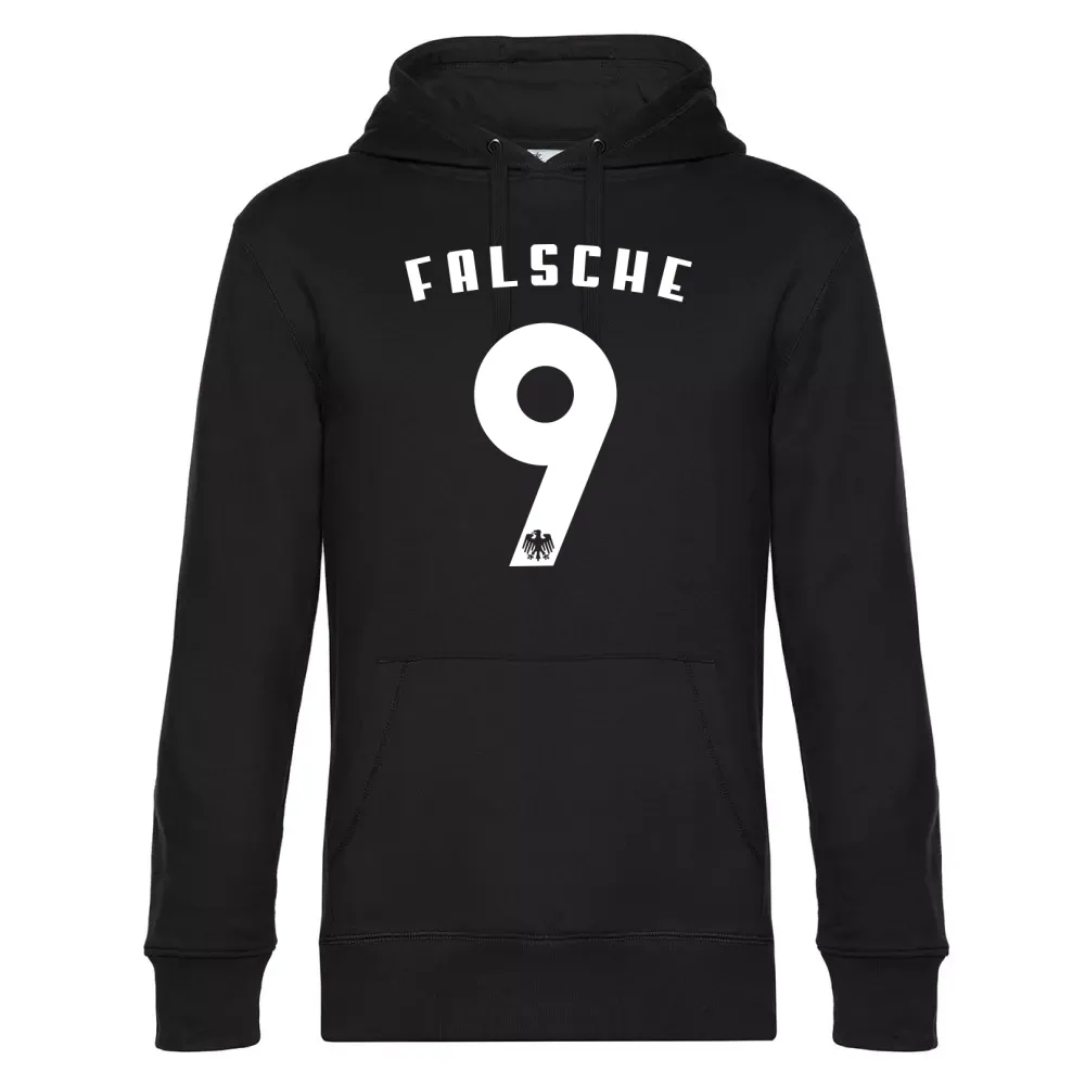 Bestelle hier dein Deutschland falsche Neun 9 Rückennummer Hoodie aus 80 % einlaufvorbehandelte, ringgesponnene, Baumwolle, gekämmt - 20 % Recyceltes Polyester und gestallte es individuell nach deinen Vorstellungen. Kombiniere dein Deutschland falsche Neun 9 Rückennummer Hoodie mit dem dazu passenden T-Shirt sowie Capi für ein rundum stimmiges Outfit.