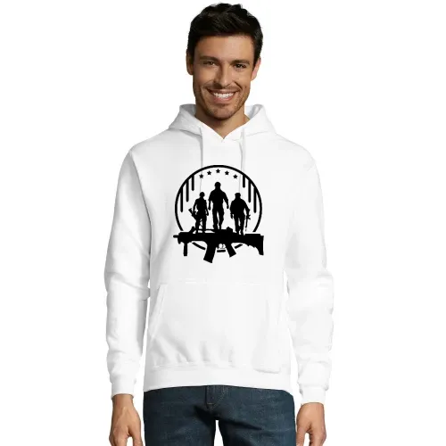 Das stilvolle Design zeigt das emblematische Sturmgewehr, das für Tapferkeit und Einsatzbereitschaft steht. Egal, ob du es im Training, in der Freizeit oder als modisches Statement trägst, dieses Motiv wird immer ein Blickfang sein. Die Kombination aus Kapuzenpulli Männer Hoodie und dem hochwertigen 50 % Baumwolle 50 % Polyester Ringspun sorgt für optimalen Tragekomfort und Langlebigkeit, sodass du lange Freude an deinem Kleidungsstück hast.