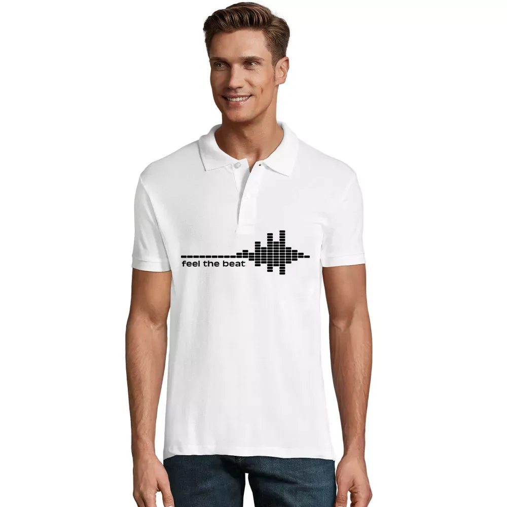 Warte nicht länger und bring deinen persönlichen Style zum Ausdruck – mit dem „Feel the Beat“-Motiv auf Männer Polo aus 100 % gekämmte Baumwolle. Mach dich bereit, im Takt des Lebens zu schwingen und fühle den Beat!