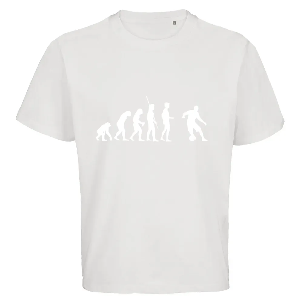 Entdecke unser einzigartiges T-Shirt, Hoodie oder Capi mit dem auffälligen Motiv Evolution Fussball. Dieses Design symbolisiert die Leidenschaft und den Geist des Fußballs in seiner Entwicklung von den Anfängen bis zur modernen Spielweise.