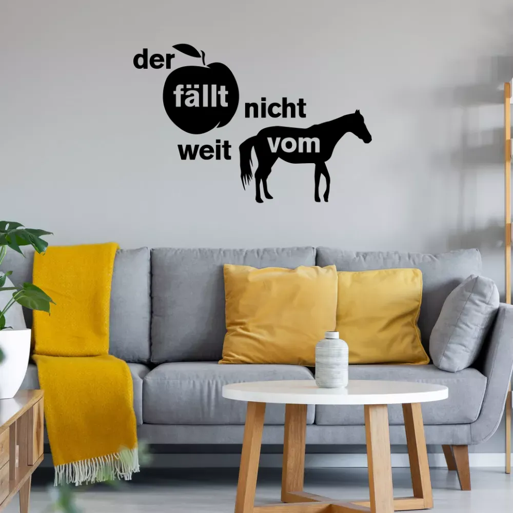 Verschönere deine Wohnzimmer mit einen der Apfel fällt nicht weit vom Pferd Wandtattoo in deiner Wunschfarbe. Du erhälst das geplottete Motiv auf einer Transferfolie. Optional kann der Aufkleber auch als der Apfel fällt nicht weit vom Pferd Heckscheibeaufkleber für Autos verwendet werden.
