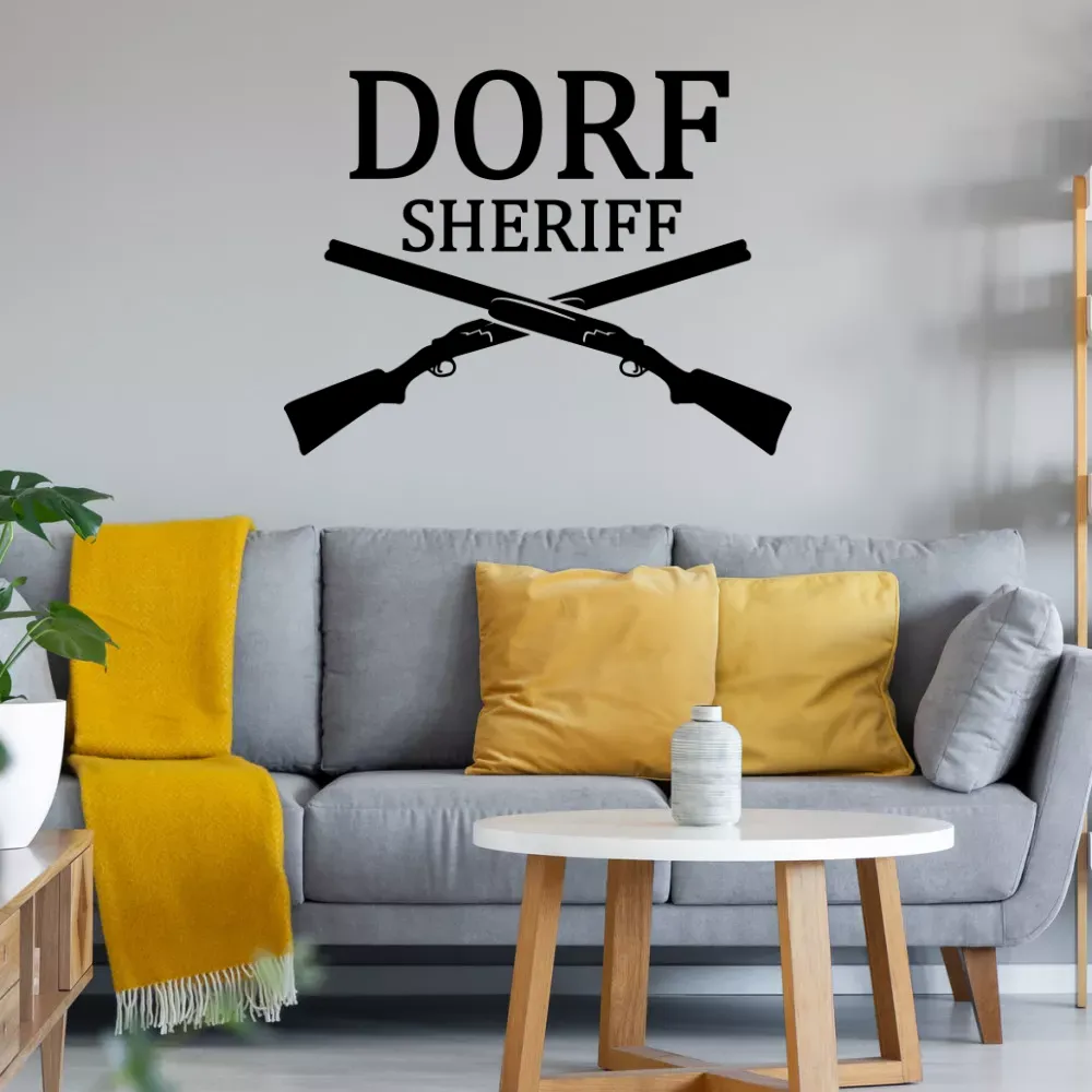 Verschönere deine Wohnzimmer mit einen Dorf Sheriff gekreuzte Flinten Wandtattoo in deiner Wunschfarbe. Du erhälst das geplottete Motiv auf einer Transferfolie. Optional kann der Aufkleber auch als Dorf Sheriff gekreuzte Flinten Heckscheibeaufkleber für Autos verwendet werden.