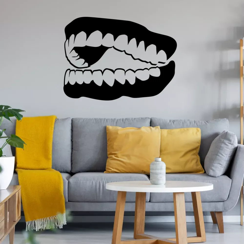 Ein lachendes Gebiss mit noch allen Zähnen ist ein strahlendes und einladendes Bild. Verschönere dein Wohnzimmer mit einem einzigartigen Wandtattoo in deiner Lieblingsfarbe! Du erhältst das kunstvoll geplottete Motiv auf einer praktischen Transferfolie, die das Anbringen kinderleicht macht. Die Zähne sind hell und blitzend weiß, und ihre gesunde Struktur deutet auf gute Mundpflege hin. Zusätzlich besteht die Möglichkeit, den Aufkleber auch als Heckscheibenaufkleber für Autos zu nutzen – so kannst du dein individuelles Design überall zeigen! Verleihe deinem Raum eine persönliche Note und sorge für einen echten Blickfang!. Der obere und untere Kiefer zeigt eine vollständige Reihe von Zähnen, die perfekt zusammenpassen und eine harmonische Form bilden.